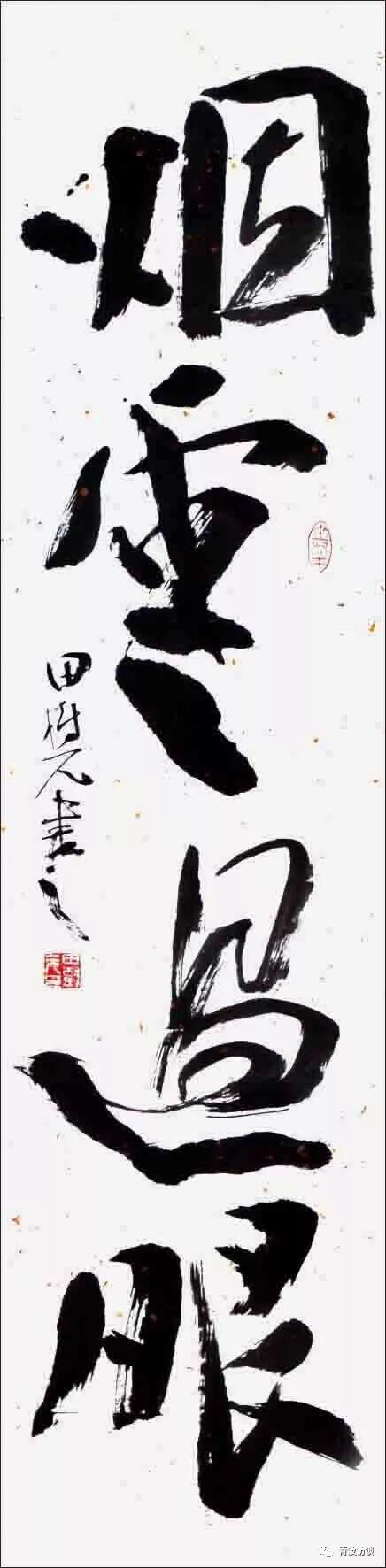 作为笔者的我,读着这一段文字,想着田先生这些年走过的路和他取得的丰硕成果,我想对他艺术的执著追求是心领神会的。特别是该文写道:古人论书,以势为先。如蔡邕的“九势”、衡桓的“书势”、王羲之的“笔势”,论的都是“势”。康有为说:得势便,则已操胜算。树元作书,用笔结体最善取势。观其作品,行书居多,参照晋唐人尺牍书法的风韵,下笔迅疾,多用侧锋,点书精严,起止分明,布局率意,洒脱多姿,俊爽挺秀中蕴涵一股雄放浑厚之气。偶尔也有寻丈之作,一次参加吉林省书法精品展,他拿出一米见方的行书对联“龙门寻遗古,雪峰观经书”,气势夺人,一举夺得金奖。显然,他是将晋人气韵,颜柳风骨,苏米意趣,皆吐纳其间,把“隽永”和“雄浑”两种截然不同的风格并存笔下,相辅相成,对立强化,营造出一种别具一格的风貌和意境。