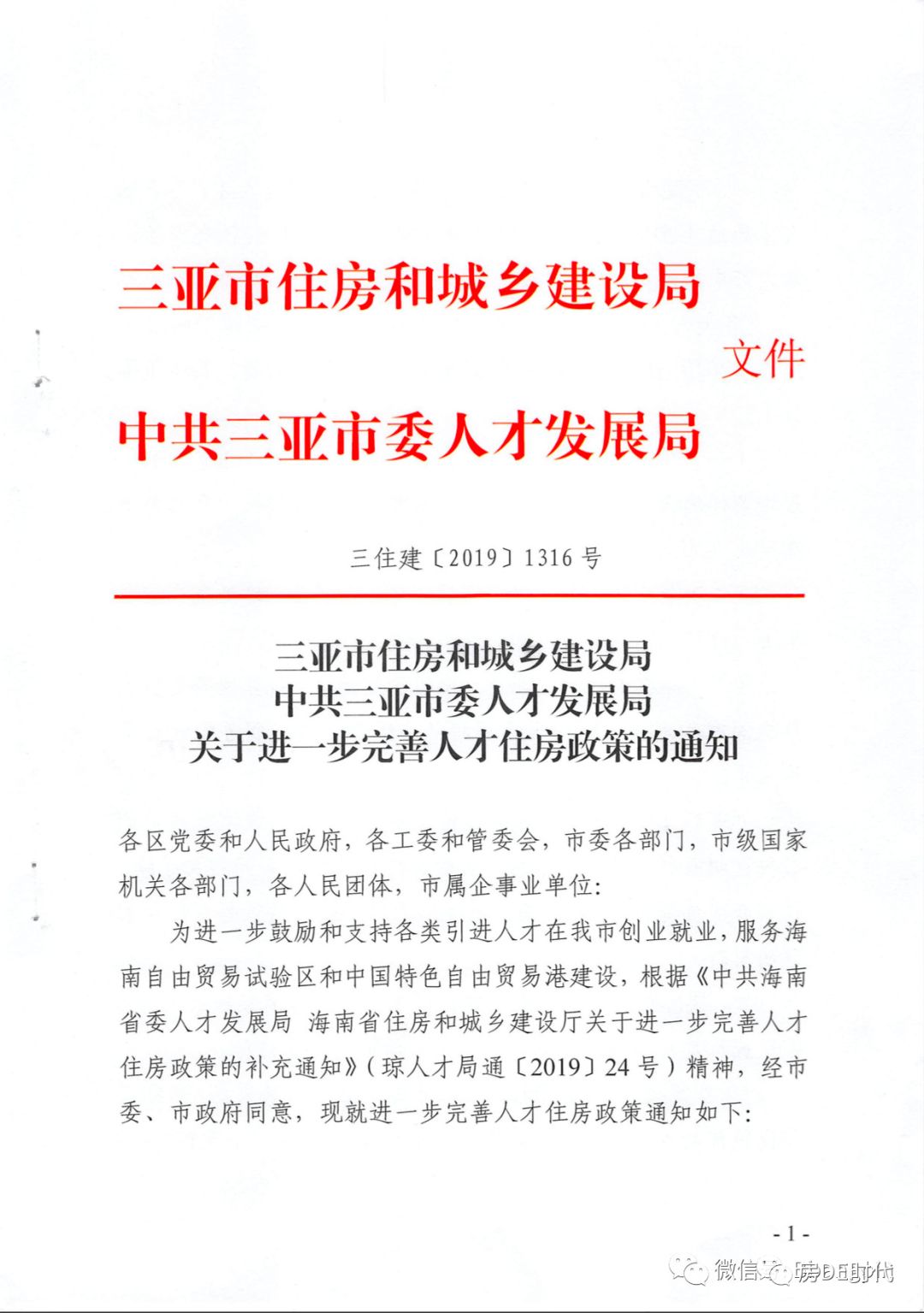 2019年10月15日,三亚市住建局与人发局联合发布了三住建【2019】第1316号文件,名为《关于进一步完善人才住房政策的通知》。
