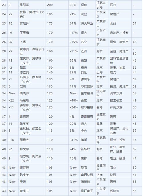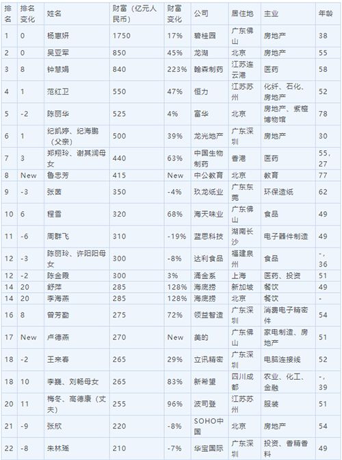 胡润研究院近日发布了《2019胡润女企业家榜》,这是胡润研究院连续第十四次发布“胡润女企业家榜”前50名。与胡润百富榜总榜不同,女企业家榜单独计算那些能够从家族财富中剥离出的女企业家的个人财富。财富计算的截止日期为2019年8月15日。