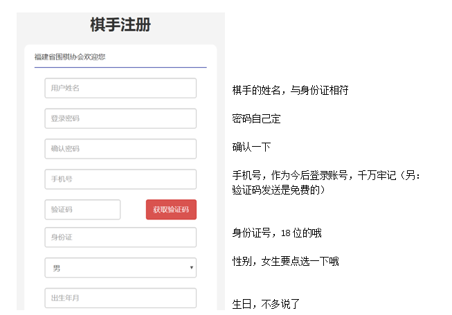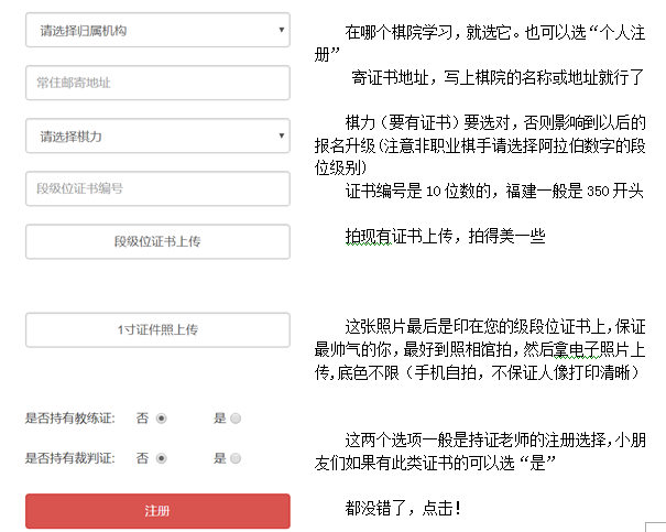 2、棋力、归属机构等重要信息注册后不得更改,请认真填写。证书、照片信息为了今后的等级分排行、证书申报打印,请保证正确无误。