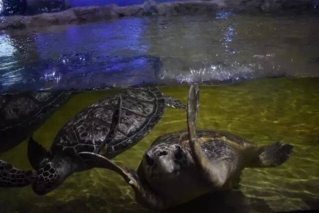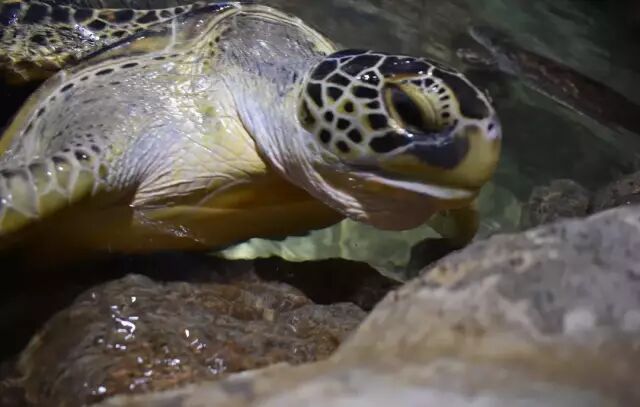 看起来憨憨的大海龟虽有着略显笨重的庞大身躯,却能够轻盈自如地翱翔在大海里,闲庭信步浮到水面上换气,四肢在海里柔软得像仙女的裙摆。呆萌的它喜欢在岩石上晒着龟壳,看到人群会用鳍拍打水面。
