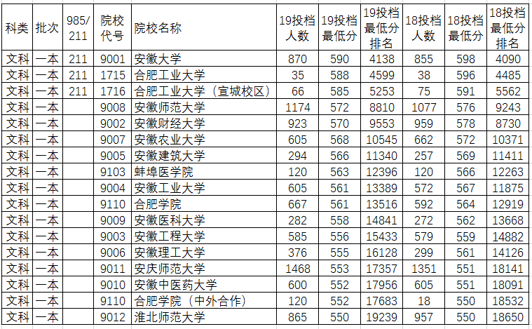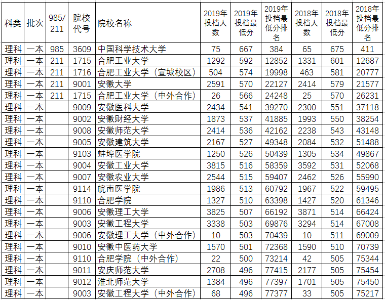 1、安徽省省内大学理科一本2019年与2018年录取对比分析 (点击图片可放大)