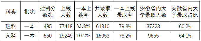 3、安徽2019年文理科一本上线、录取及省内大学录取占比分析(点击图片可放大)
