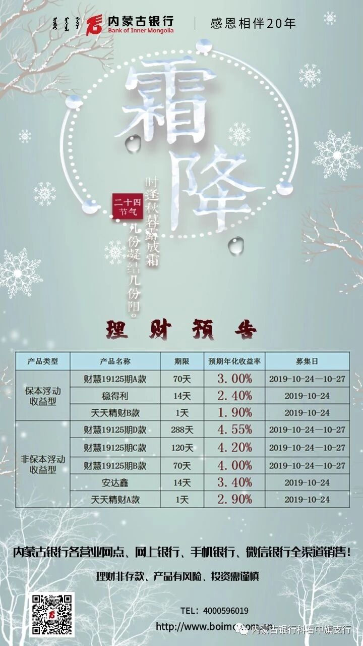 霜降,内蒙古银行科右中旗支行提醒您:天气渐凉,请注意保暖.今日理财推荐,柜面、网银、手机银行、微信银行均可购买.