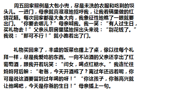 中午,奶奶确确实实让我吃得好,吃的虽然很普通,但我吃起来却很美味。以后十几年的日子里,奶奶就这样想着法子让我吃饱穿暖。奶奶经常做的菜是萝卜白菜,虽然同学中有很多人吃的厌了,但我永远也吃不腻。