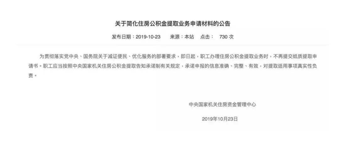 23日,中央国家机关住房资金管理中心网站发布《关于简化住房公积金提取业务申请材料的公告》称,即日起,职工办理住房公积金提取业务时,不再提交纸质提取申请书。