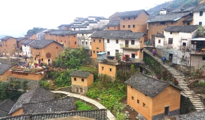 阳产土楼-依山而筑,运用原汁原味的原材料,夯土成墙,伐木建梁,采竹为筋,青石筑基与铺路,房屋外观全是材质自带色。