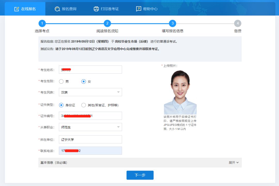 2)填写完整的个人信息后,上传电子版照片,个人近期1寸免冠照片,背景颜色无要求,尺寸为390*567,格式为jpg,大小不超过1M。认真审核所填信息,无误后点击“下一步”按钮(点击此按钮后信息无法进行修改),如信息有误、照片不符合要求报名无效;