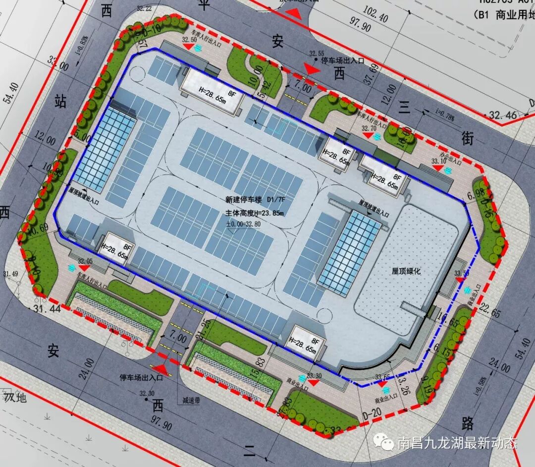 项目估算总投资14005.22万元(不含土地费)。根据批复,该项目将新建地上7层、地下1层自走式停车楼和商业及配套用房,主体高度为23.85米,楼顶设有屋顶坡道出入口、屋顶绿化等,项目现代感十足。如下图:
