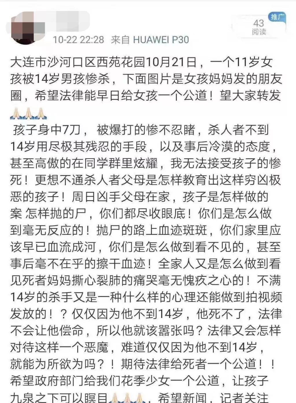 近日,有网友在微博反映,10月20日,大连市沙河口区有一名11岁女孩被一名14岁男孩杀害,女孩身中7刀。当时男孩将美术班补课结束路过的女孩带至家中,想要与其发生性关系遭拒绝,便将女孩杀害并抛尸。