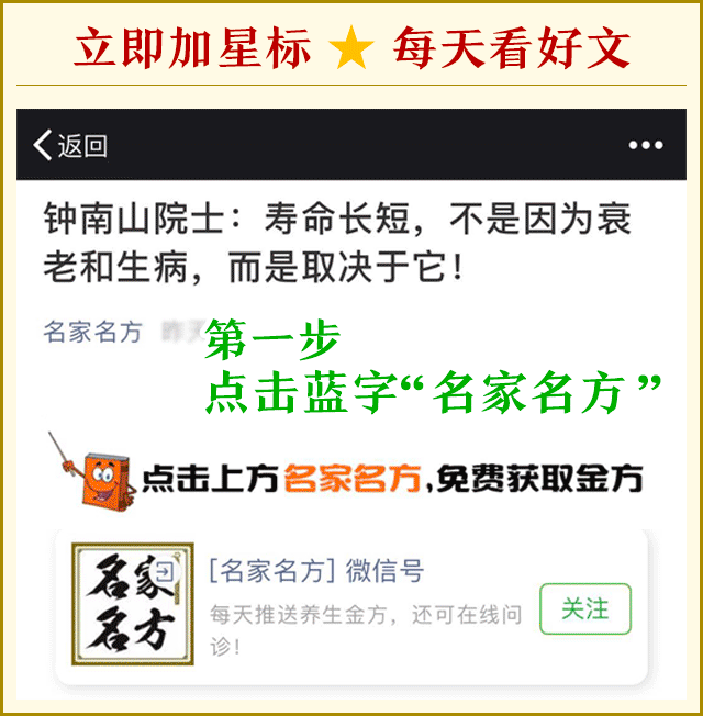 亲爱的方粉们,如果想每天都和健康相伴,记得把名家名方设为星标哦,赶紧加起来,有惊喜哟~添加方法如下↓↓↓