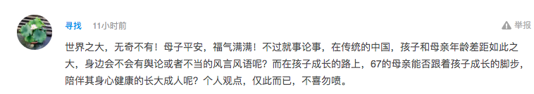 医护人员称,产妇是该院一名退休大夫,姓田,今年67岁。报道描述为“面色红润,精神状况良好”。