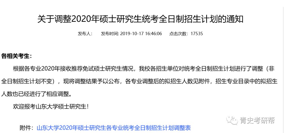 山东大学在很早之前就公布了招生目录,但没有公布各个学科招收多少额。版主依据研招网给的招生人数,其中中国史儒学高等研究院招5人,历史学院招招生15人。世界史历史学院招3人,东北亚研究院招1人。这些人数应该是不包含推免生的。但是,招完推免生以后,山东大学公布了依据推免生人数而最后确定的考试招生名额,这份名额人数与之前的招生计划有了一些区别。