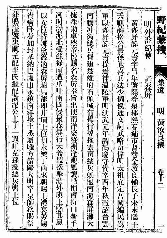 《皇明文衡 卷八十一》:《浡泥国并肩王森屏黄公神道碑》--胡广 皇明永乐六年秋八月乙未,浡泥国王麻那惹加那乃黄公森屏讳元寿云南腾冲卫总兵率其甥妹部属者凡百五十余人至阙下也,来朝上表、贡方物。上御奉天殿,受其献。退即奉天门,召与语,象通其言,曰:"僻壤臣妾,诞被圣化,思睹清光,靡知忌畏,辄敢尘渎。"又曰:"天以覆我,地以载我,天子以乂宁我。我长我幼,处有安居,食有和味,衣有宜服,利用备器,以资其生;强不敢凌弱,众不敢欺寡,非天子孰使之然也?!天子功德暨于我者,同乎天地。然天地仰而见,局面履,惟天子邈而难见。是故诚有所不通。僻陋臣妾,不惮险远,浮诣阙下,以达其诚!"上曰:"嘻!惟天、惟皇考付予以天下,子养民;天与皇考,视民同仁。予其承天与皇考付界之重,惟恐弗堪,弗若汝言!"则又顿首曰:"自天子改元之初载,臣国屡丰和:山川之蕴珍宝者,霅然而呈;草木之不华者,霍然而实;异禽跄鸣,而走兽率舞也。臣国之老曰:'华夏圣人,德教流溢于兹'。臣土虽远京师,然为天子氓,故矜奋而来觐。"上嘉其诚,优待礼隆,赐予甚厚。初赐宴于华盖殿,既连宴于奉天门。每宴,则命公夫人宴其妻、于内馆。罢宴,敕大官厚具献食;日命大臣一人侍于所舍,中贵人专接伴,盛其班张,丰其禀饩,入朝,班次上公,宠屋至矣!逾月,王忽感疾。上命医,赐善药调治;遣中贵人劳问。旦暮相继。日命大臣,视王疾差;剧闻小瘳,喜见颜色。王疾笃,语其妻以下曰:"我疾,贻天子忧念,脱有大故,命也。我僻处荒徼,幸入朝睹天子声光,即死无憾。死,又体魄托葬中华,不为夷鬼!所憾者,受天子深恩,生不能报,死诚有负。"指其子曰:"我即不起,其以儿入,拜谢天子:誓世世毋忘天子恩。若等克如我志,瞑目无憾矣?"十月乙亥朔,王卒,得年古稀。上甚悼之。辍正朝三日;敕有司,治丧具,厚恤典,赐谥曰"忠顺"。遣使谕祭,又遣使抚慰其妻、子。王之妻拜使者曰:"乃下臣祚薄,弗克负荷天子深恩,不能终事且没。有遗命,以'世世毋忘天子恩。克守其言,则死犹不死矣!"王之妻之言,亦可谓贤也已。是月庚寅,以礼葬王于安德门外之石子岗。敕为文,志其圹。王父曰麻那惹沙那旺沙;母曰刺失八的;妻曰他系邪;子一人克孙,曰遐旺,甫十四岁,女二桂姑,桂娘。以遐旺袭王爵,赐以冠服、玉带、仪仗、鞍马、服物、器皿及金银、锦绮、钱币甚厚。赐王妻以命服、珠冠、白金、锦绮、钱币诸物。其余,赐各有差。官王之弟施里难那那惹、施里微喏那沙那、那万喏邪三人,俾辅遐旺。诏有司,立祠于王墓。置守坟者三户。敕建碑祠下,命臣广,制刻文。臣广仰惟皇上绥宁宇内,茂扬天德,溥博周遍;凡日月照临之地,皆心悦诚归,惟恐或后,奉琛秉贽之国,辍集于庭,岁以万数,浡泥王去中国,累数万里,一旦举妻孥、妹戚、陪臣,浮钜海来朝,不以为难;叩陛陈辞,忠诚溢发,其心坚确,有如金石。至其临终之言,尤拳拳属其下以不忘天子恩。圣德渐渍,感动于人心。其深如此,于乎盛哉!惟王贤达聪明,忠顺之节,始终一致;宜其身被宠荣,泽延后嗣。用纪其实,声为铭诗,昭示无极,以彰王之所以受恩深厚者,由其诚也。铭曰:"大明御天,臣妾万方,孰不来享,孰不来王。倚欤浡泥,邈处炎徼,感化来归,风腾云趭。曰妇曰子,甥妹陪臣,秩秩稽颡,趋拤甡甡。跽曰天子,作吾父母;王生阿里,谟沙之婿。戴天覆地,畴比幪幈,翘首大明,遹来献诚。天子曰吁,予统宇内,绥尔于宁,惟德罔逮。王拜稽首,万岁欢呼,服德怀仁,春育海濡。国有山川,匿其宝物,灵发其藏,不爱而出。荏苒草木,惟叶蓁蓁,煌煌者华,有实其蒉。异禽和音,鸣拂其羽,走兽麇麇,亦跄以舞。国黄耇曰,圣化所渐,臣国虽逖,臣心仰瞻。亲王联姻,待以异礼,宴劳锡赉,有厚而旨。云胡期月,疾忽及之,奄然而丧,复悼而悲。临终之言,疆土归华,渤泥弗忘,天子深恩。于乎贤王,卓特超逸,西南诸蕃,靡堪王匹。生者诚款、永镇南洋,爵于王胤,世泽金墩。有坟如堂,有祠翼翼,以妥王灵,魂魄归乡。森屏元寿,赐予王礼,总兵克孙,世袭苏丹、男丁传位,万世恩荣。公享天年,六十有八。