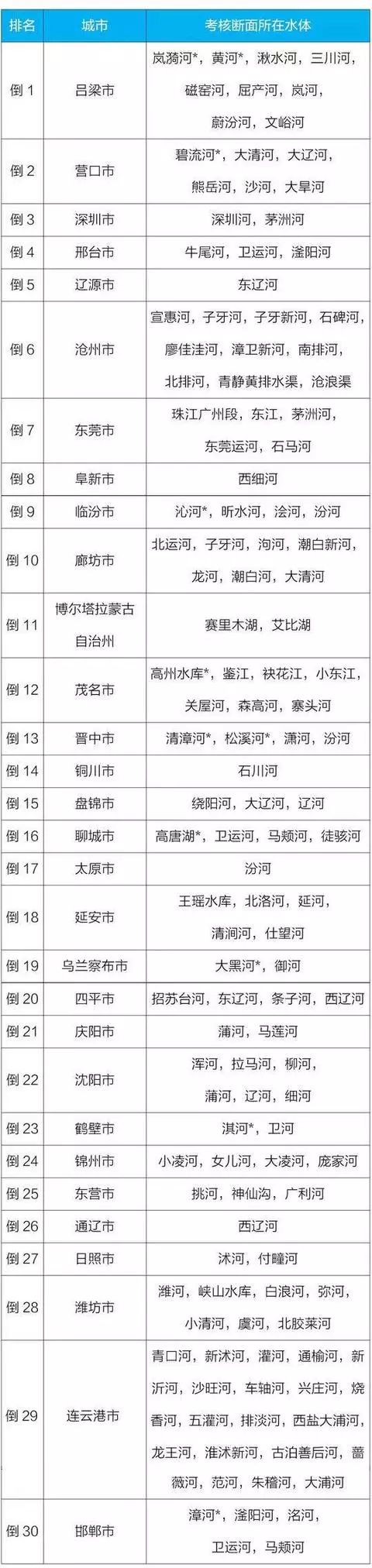 2019年1-9月国家地表水考核断面水环境质量状况排名后30位城市及所在水体。图据生态环境部